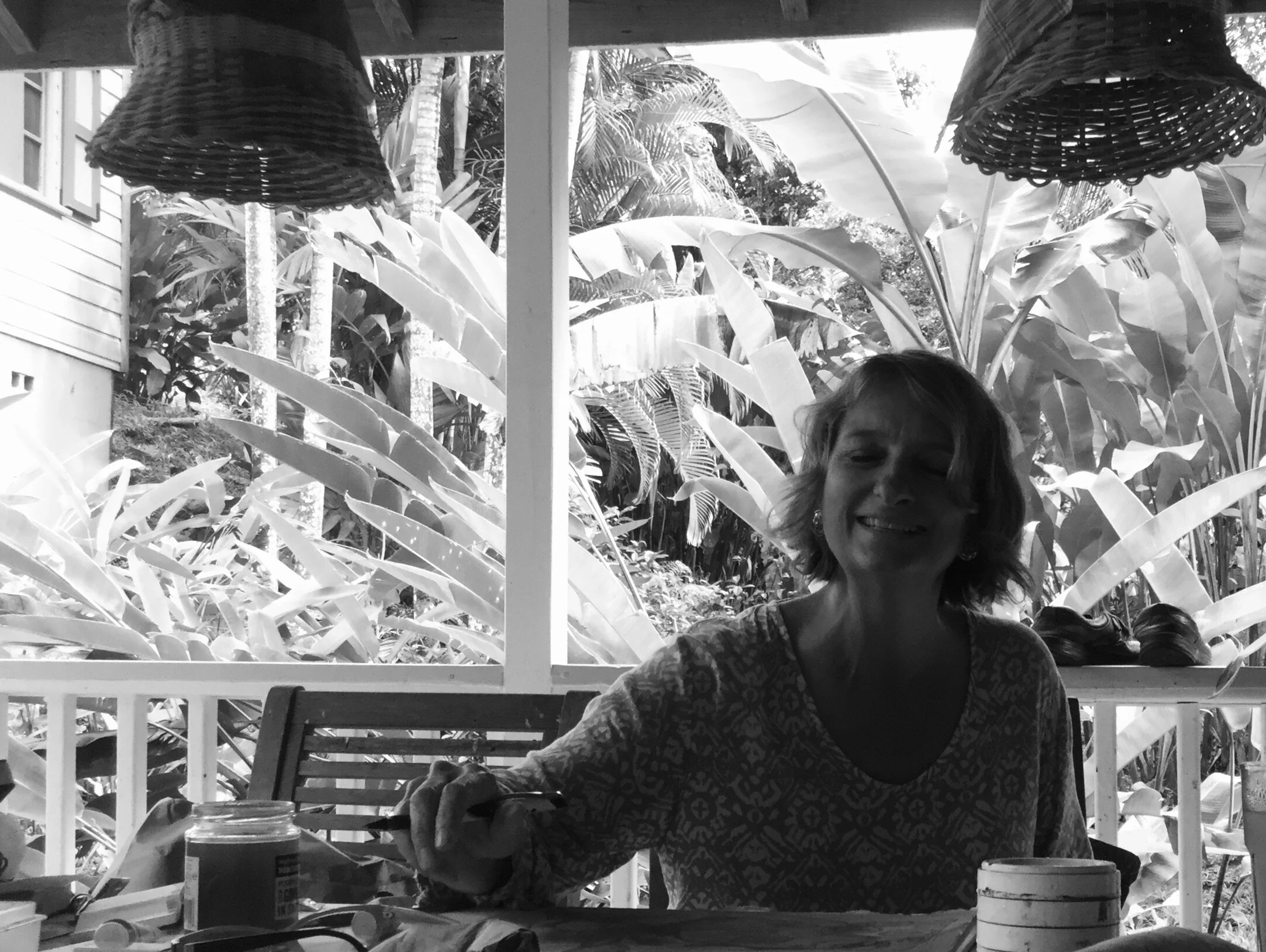 “I am a full time artist living in the rainforest in Antigua with my family. I spend a lot of time in the garden with my friends & fellow artists. There is enough inspiration in this garden alone to keep me going for another hundred years. Over the years I have developed a unique way of painting with oil paint & gold leaf on wooden shingles. At first I was inspired to paint migratory birds, enjoying their long streamlined bodies flying over the landscape below. Then I developed a series of paintings of people dancing in the garden in patterned clothing called the ‘rainforest dancer series’. This developed into a new series of people working in the garden. I enjoy the shapes of the body at work using traditional gardening tools. The backgrounds were inspired by the garden. I love to share the beauty of the garden & the people I connect with through my work.”